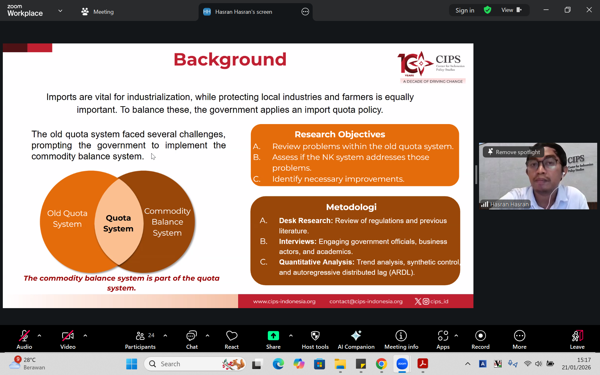 The webinar featured Hasran, Senior Research and Policy Analyst from the Center for Indonesian Policy Studies (CIPS), who provided an in-depth overview of the Commodity Balance Framework, highlighting its policy objectives, implementation mechanisms, and the practical implications for businesses operating in Indonesia. The discussion also explored how companies can better anticipate regulatory changes and align their strategies accordingly.