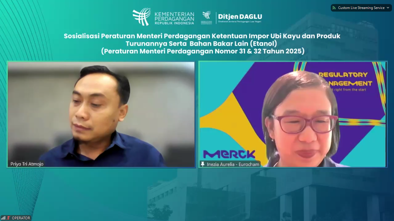 The EuroCham Chemical Working Group participated in the socialization session of the Ministry of Trade Regulation No. 31 and No. 32 of 2025, organized by the Ministry of Trade. The event was opened by Iman Kustiaman, Director of Imports, and highlighted changes in import policies covering agricultural products, livestock, chemicals, hazardous materials, and mining products.